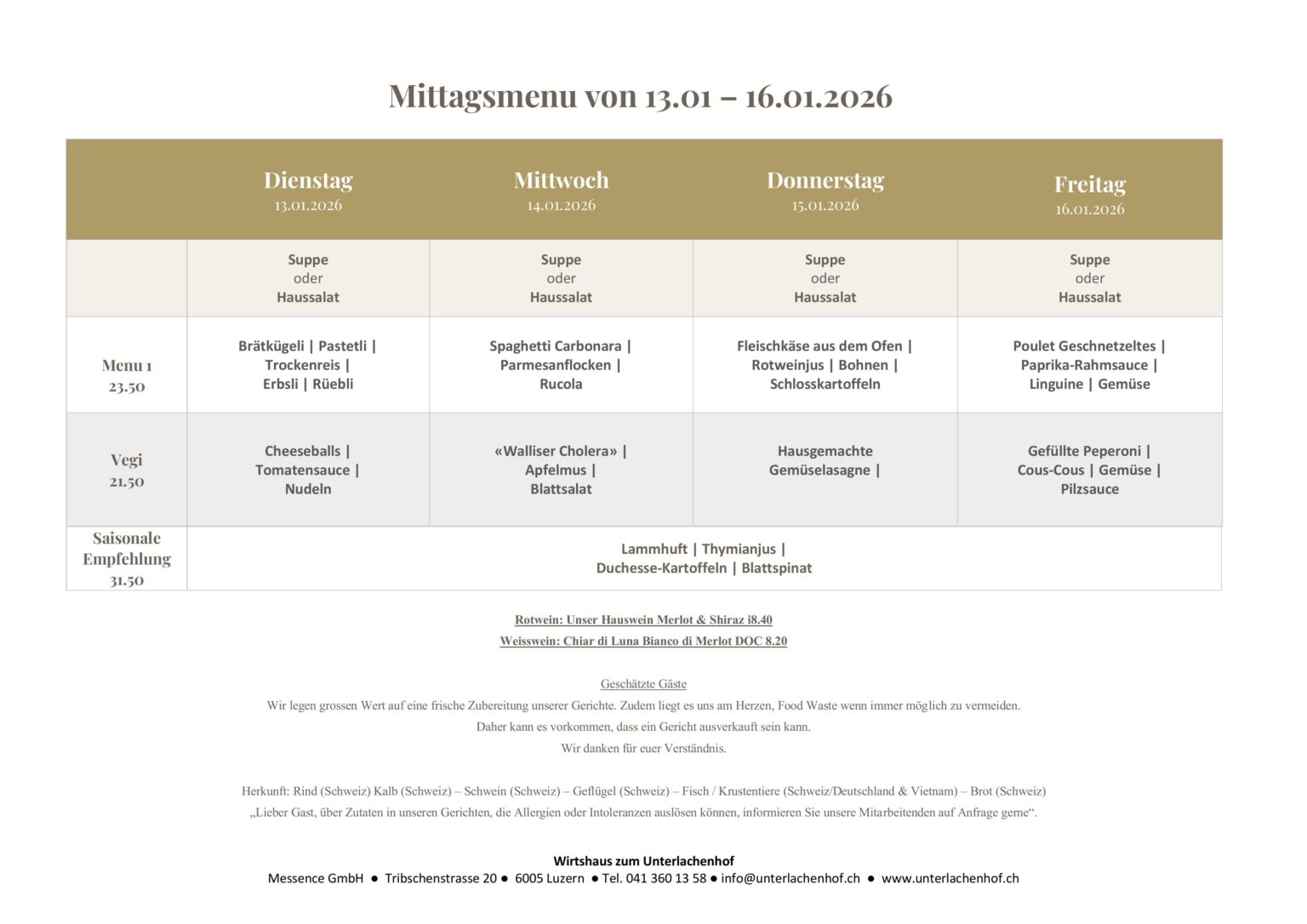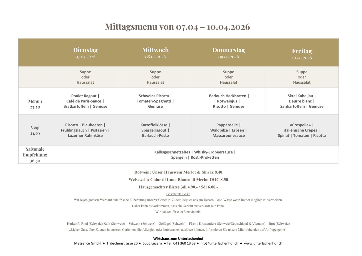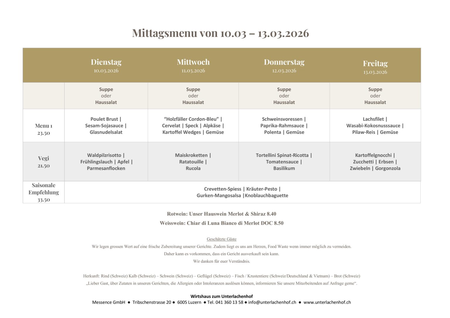 Mittagsmenüs Speisekarte MITTAGSMENÜS Weinkarte Menüvorschläge EVENTS Speisekarte MITTAGSMENÜS Weinkarte Menüvorschläge EVENTS